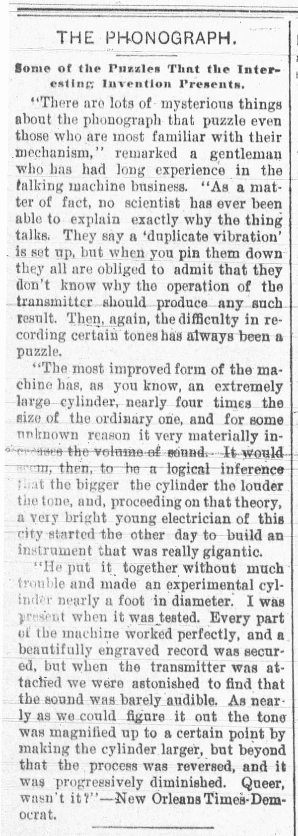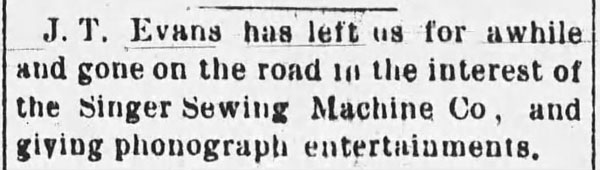Most of the early articles appearing in local newspapers about the phonograph originated from newspapers in larger cities. In the 1880's articles often described how the phonograph was being improved and what it would soon do, often with humor. Long before many would hear a phonograph they would read about how it was being used around the USA and the world. When the phonograph became a consumer product in the 1890's the phonograph ads began appearing in newspapers and national magazines.
