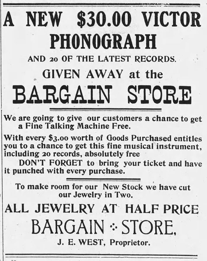 Advertisements for local businesses that were selling phonographs and records are also included along with 'notices' of recent purchases of a phonograph that would be identified in newspapers as part of its promotion.