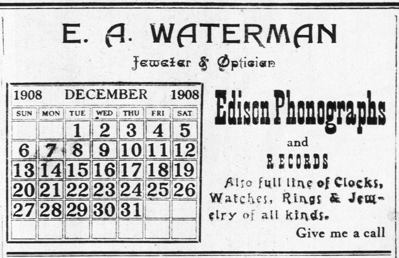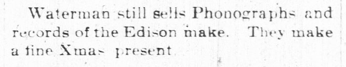 Waterman still sells Edison Phonograph and records. A fine Xmas present. The Gordon Journal, December 13, 1907