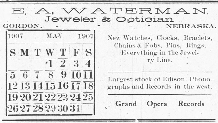 Waterman's Jeweler & Optician, and Jordan's both of Gordon, Nebraska and the closest stores to the Sandoz homestead where Edison Phonographs and Records could be purchased.