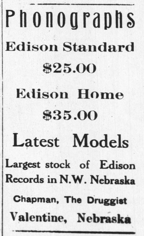 Edison Phonograph ad for Chapman’s in Valentine, Nebraska - said to have the "largest stock of Edison Records in N. W. Nebraska"