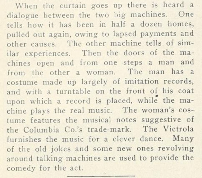 They dance to the music of the Victrola and make many of the old jokes and new ones about talking machines to provide the comedy for the act.