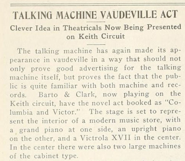 The vaudeville team Barto & Clark played the circuit in 1918 and were noted in the The Talking Machine World of December 1917 for their novel act booked as "Columbia and Victor."