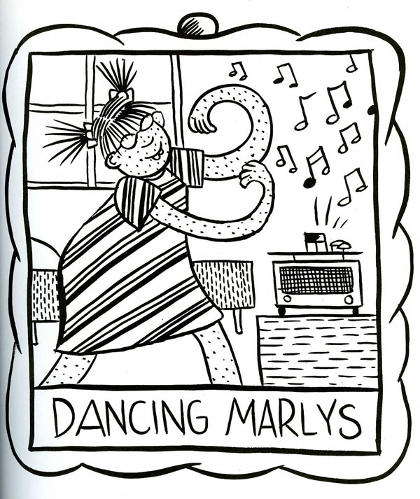 white cartoon titled "DANCING MARLYS" is a simlilar illustration