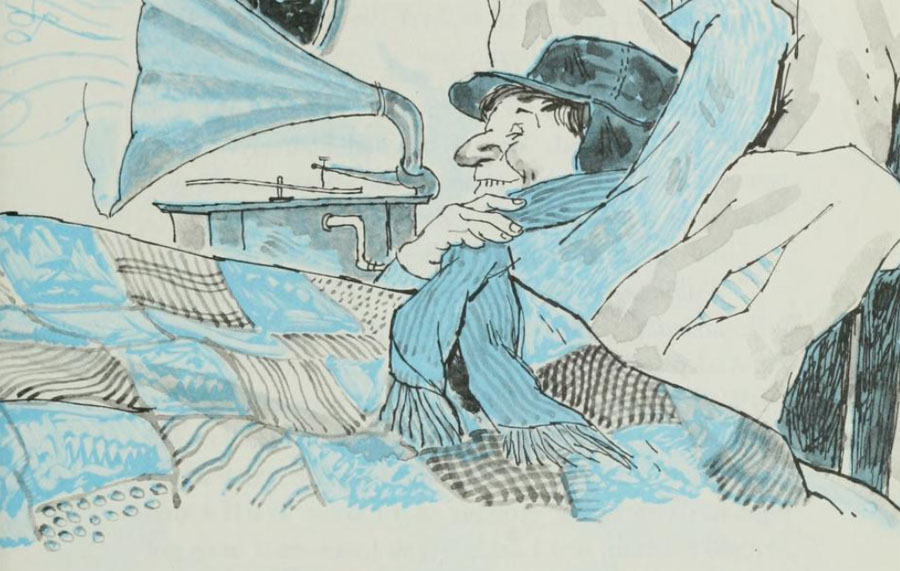 As a book on the shelf of Phonographia's PhonoLiterature this story has references to both playing records and illustrations of listening to the phonograph.