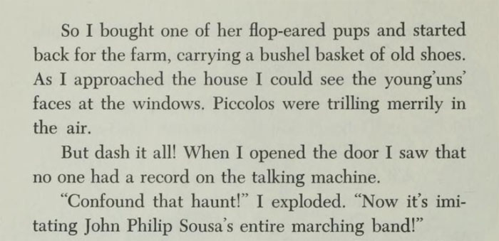 The following year an even more uncommon cold winter came. It was a "dreadful cold winter" and in the Winter of the Big Freeze "some downright unusual things" happened. "Red barns for miles around turned blue with the cold." "One day the temperature fell so low that sunlight froze on the ground." Through it all the family listened to their talking machine and John Philip Sousa's band. "My, those piccolos did sound pretty!" But when the ghosts came back, to Mr. McGroom's great displeasure, they were even able to fool him into thinking he was hearing the piccolos from his talking machine. "Confound that haunt!" McGroom exploded. "Now it's imitating John Philip Sousa's entire marching band!"