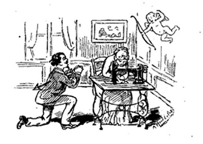 One evening, while the young girl was stitching, with the aid of her sewing machine, one of those silver metal thread edgings with which it was the fashion to tuck in camisoles, the young man stood very close to her and spoke to her of his love in exceedingly lively terms.