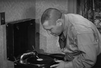 Tabletop phonograph - John Derek, John Barrymore, Jr., and Mona Freeman in Republic Pictures Corporation WWII movie filmed at Fort Sill, Oklahoma, United States. Phonograph scene in army barracks. See Movie Still.