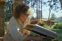 Columbia portable - First line of movie, something about "He even took his gramophone." Other scenes with Columbia portable, dancing by the campfire in Kenya. Denys (Robert Redford) takes a phonograph on safari and plays it in a clearing for some apes to hear. The apes like the music and Redford says to Meryl Streep, "Imagine that. Never a human sound, and then Mozart." Also a Victrola tabletop being played on the porch. See Screenshot.