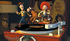 Record Player Scene - Walt Disney Productions ©1999 - Woody and his Round-Up Gang running on the phonograph record as it turns and changes speeds is one of the great Phonographia scenes of all time. The 1950's style multi-speed Phonograph takes the gang for a ride. See Movie Still and Watch Movie Clip.