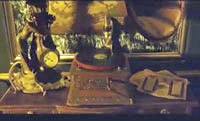Ornate gramophone playing record. Used as a "mood"machine for an intimate scene. See Movie Still and Movie Clip (6 second zoom-in of the gramophone).